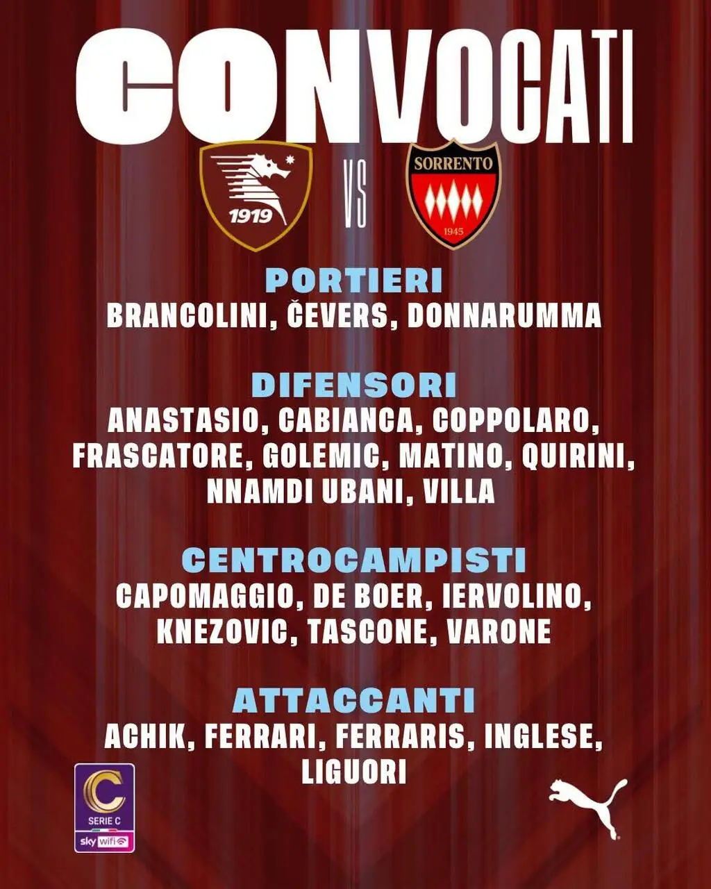 Al termine della rifinitura di questa mattina al centro sportivo Mary Rosy, mister Giuseppe Raffaele ha convocato 23 calciatori per la sfida in programma domani sera alle 20:30 allo stadio Arechi contro il Sorrento, valevole per la quarta giornata del campionato di Serie C Sky Wifi 2025/26. Di seguito l’elenco: