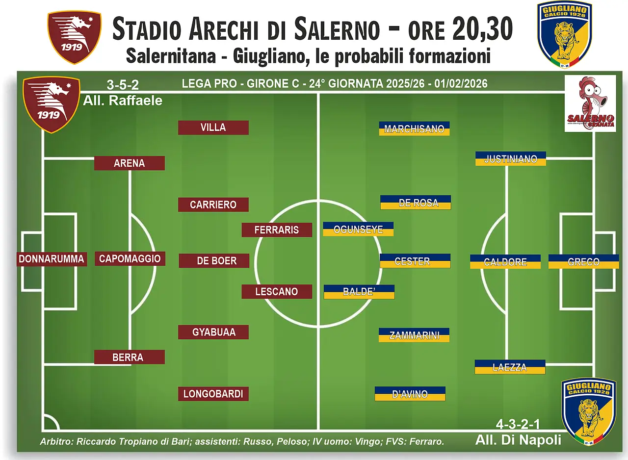 Salernitana (3-5-2): Donnarumma; Berra, Capomaggio, Arena; Longobardi, Carriero, Gyabuaa, De Boer, Villa; Ferraris, Lescano. A disp: Brancolini, Cevers, Golemic, Quirini, Tascone, Iervolino, Di Vico, Achik, Ferrari, Liguori, Molina. All: Raffaele
