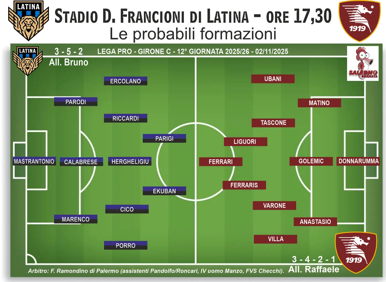 Dall’altra parte arriva una Salernitana che conosce il peso specifico del pomeriggio: dopo il 2-2 del Catania a Caserta nella notte di Halloween, un risultato positivo varrebbe lo strappo a +3 sugli etnei. E a spingere la Bersagliera ci saranno 2.600 tifosi nel settore ospiti, un’onda granata pronta a farsi sentire nel Lazio. Giuseppe Raffaele resta fedele al 3-4-2-1 e chiede lucidità, gestione dei momenti e zero presunzione: partita da maneggiare con cura, senza sbavature, perché il Latina in casa è squadra ruvida e organizzata.