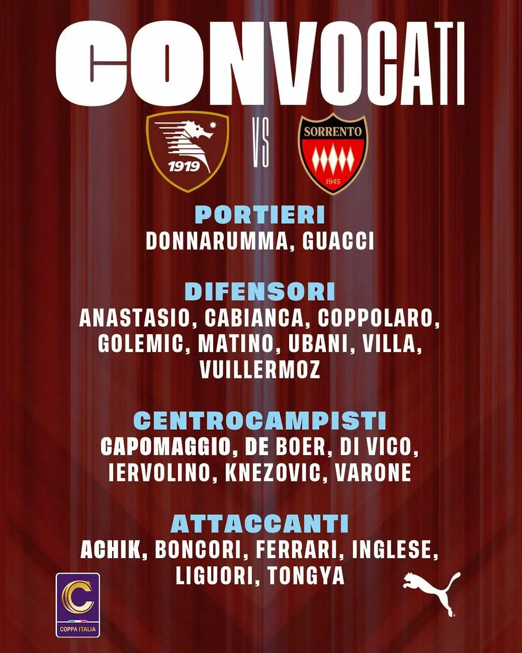 Al termine della rifinitura di questo pomeriggio al centro sportivo Mary Rosy, mister Giuseppe Raffaele ha convocato ventidue calciatori per la sfida in programma domani sera allo stadio Arechi (ore 21, porte chiuse) contro il Sorrento, valevole per il primo turno eliminatorio della Coppa Italia di Serie C.