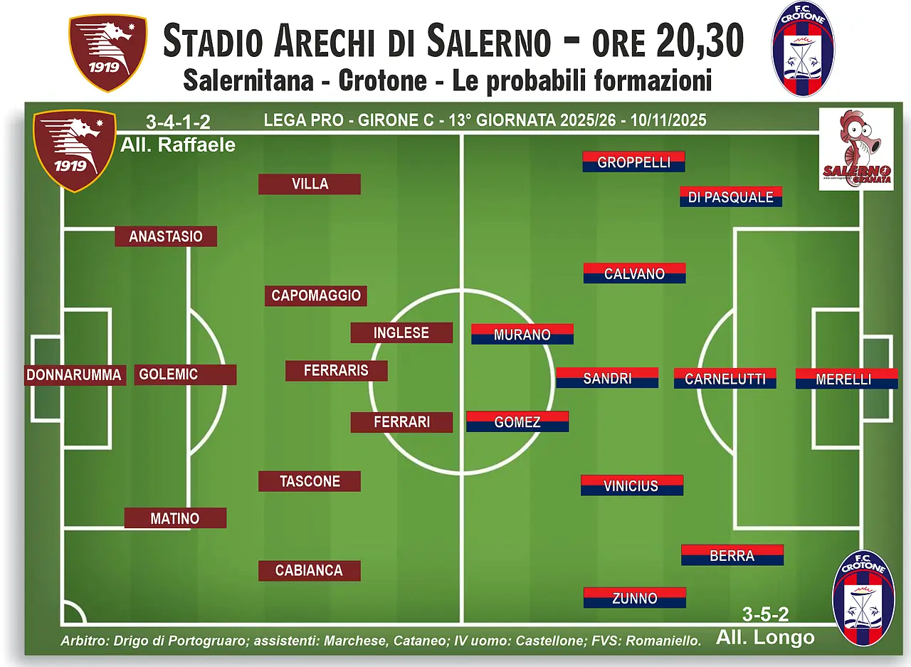 Salernitana–Crotone, Arechi ore 20.30: Raffaele rilancia il 3-4-1-2 con Capomaggio dal 1’, Cabianca a destra e Ferraris tra le linee. Notte da segnale alla B