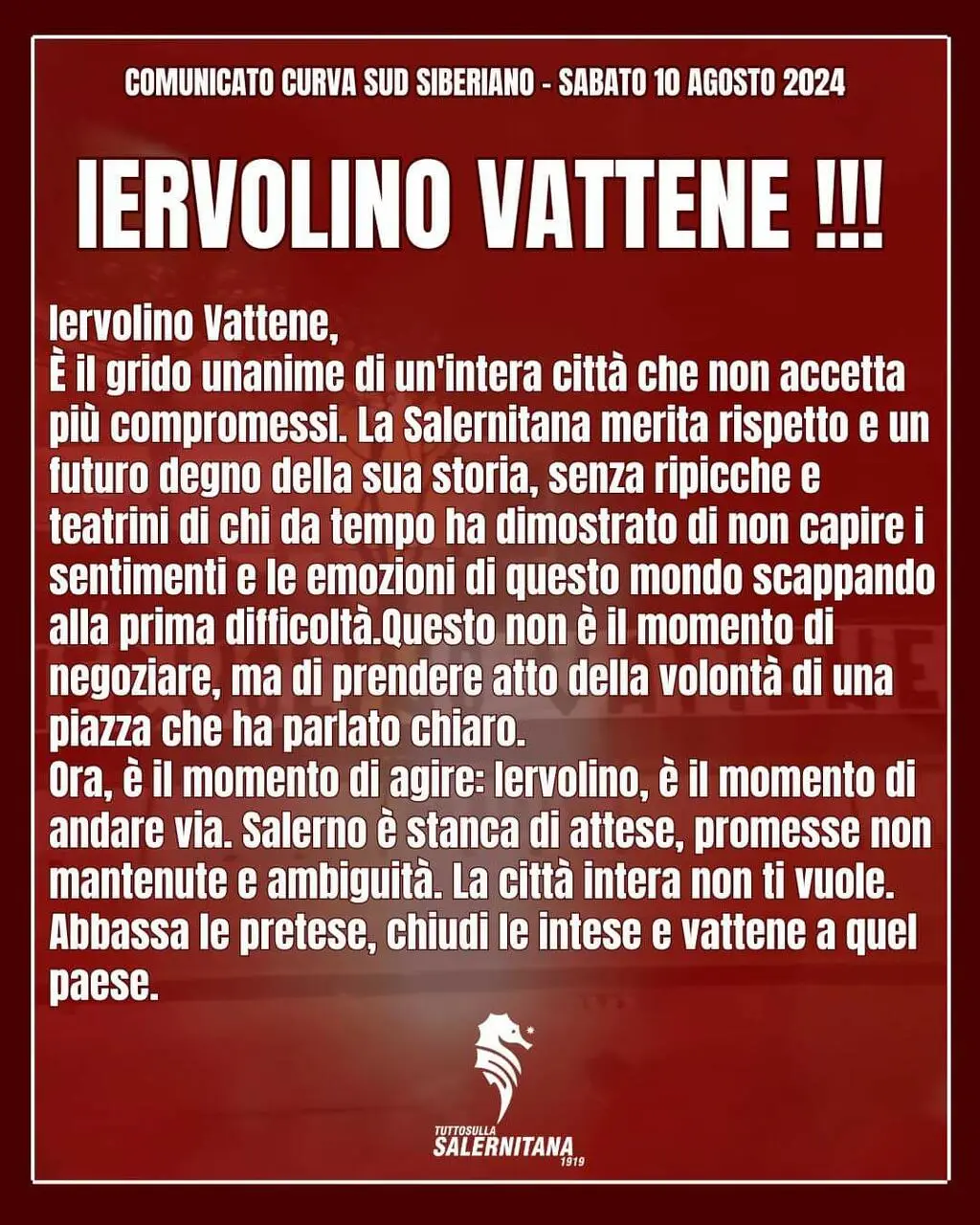 “Iervolino vattene. È il grido unanime di un’intera città che non accetta più compromessi. La Salernitana merita rispetto e un futuro degno della sua storia, senza ripicche e teatrini di chi da tempo ha dimostrato di non capire i sentimenti e le emozioni di questo mondo, scappando alla prima difficoltà. Questo non è il momento di negoziare, ma di prendere atto della volontà di una piazza che ha parlato chiaro. Ora è il momento di agire: Iervolino, è il momento di andare via. Salerno è stanca di attese, promesse non mantenute e ambiguità. La città intera non ti vuole. Abbassa le pretese, chiudi le intese e va via!”