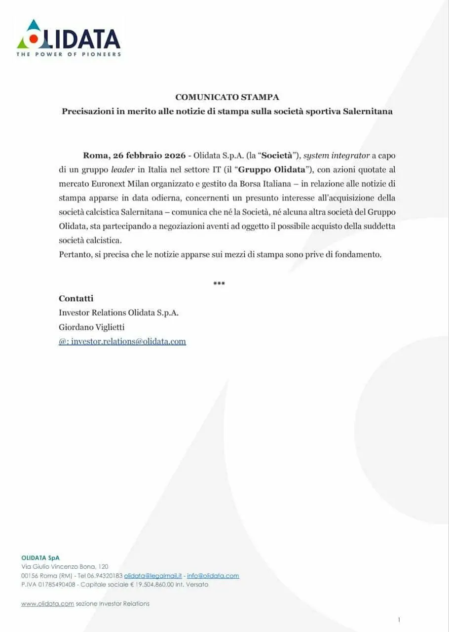 Non si è fatta attendere la risposta del gruppo Olidata che, in mattinata era stato segnalato dal quotidiano “Le Cronache” com'è possibile acquirente della Salernitana