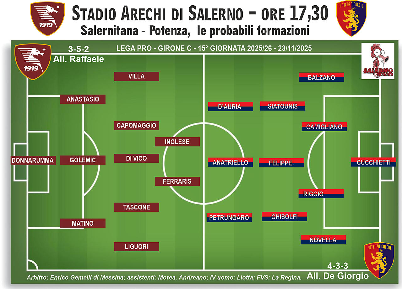 Dall’altra parte, De Giorgio deve rinunciare allo squalificato Bachini e agli infortunati Castorani ed Erradi. Nel 4-3-3, davanti a Cucchietti, esperienza e solidità con Novella, Riggio, Camigliano e Balzano. In mediana, geometrie e corsa con Ghisolfi, Felippe e Siatounis; davanti tridente mobile: Petrungaro e D’Auria larghi a supporto del centravanti Anatriello. Un undici pronto a mettere pressione soprattutto sulle corsie esterne, dove la Salernitana dovrà alzare subito i giri.