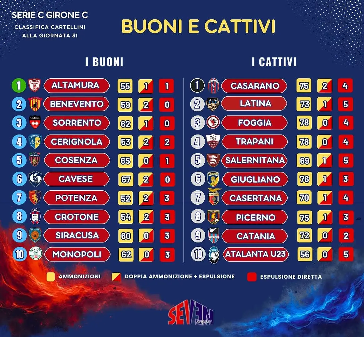 Il sito Seven Sport, ha stilato una classifica di “Buoni e Cattivi” per quasnto riguarda la lega PRo girone C, contando tutti i cartellini ricevuti sino alla 31' giornata (gialli, doppi gialli e rossi).