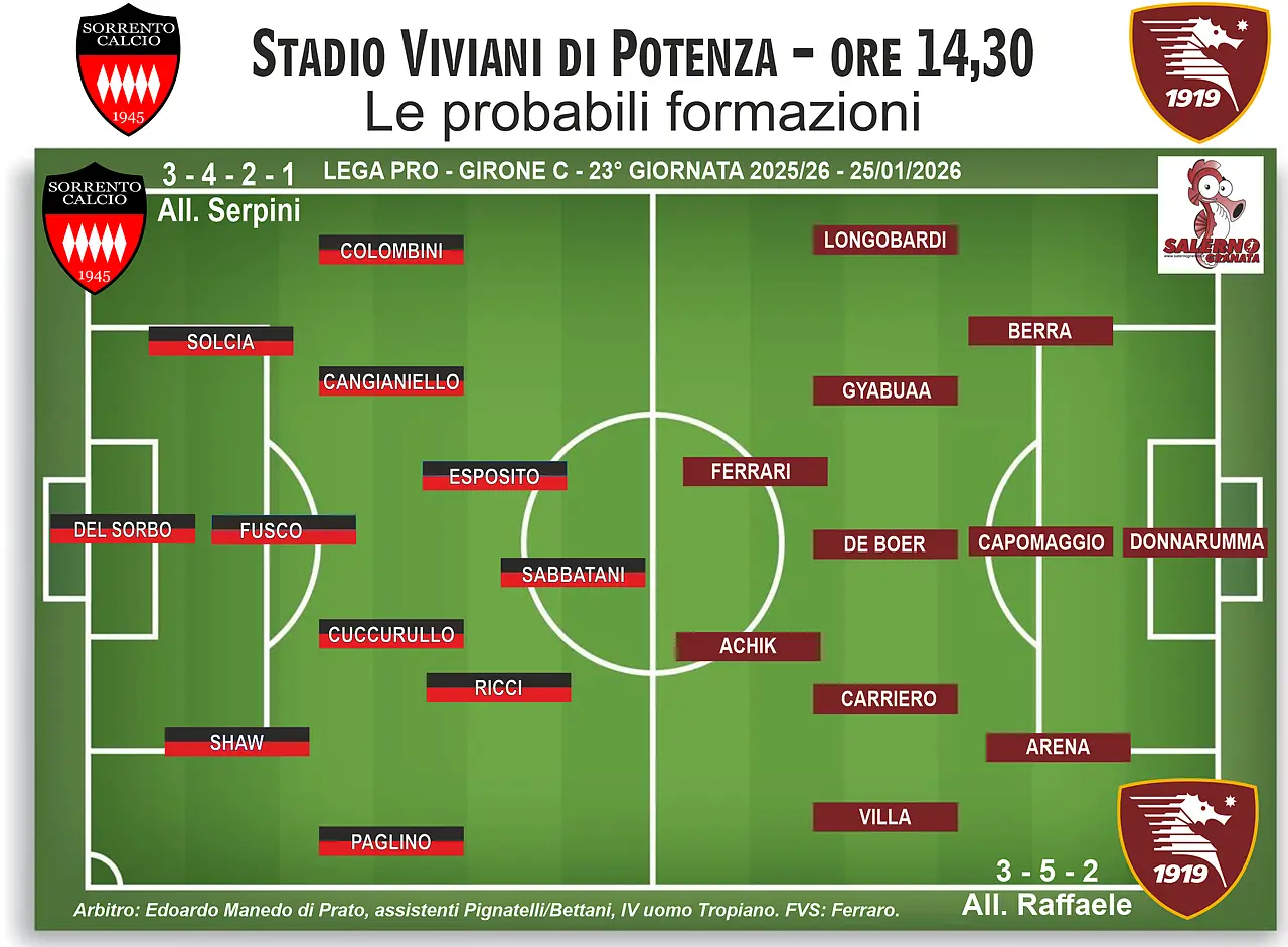 Sorrento (3-4-2-1): Del Sorbo; Solcia, Shaw, Fusco; Paglino, Cangianiello, Cuccurullo, Colombini; Ricci, Esposito; Sabbatani. A disp: Harrasser, Di Somma, Crecco, Milan, Matera, Potenza, Riccardi, Vilardi, Tonni, Bernabeo. All: Serpini