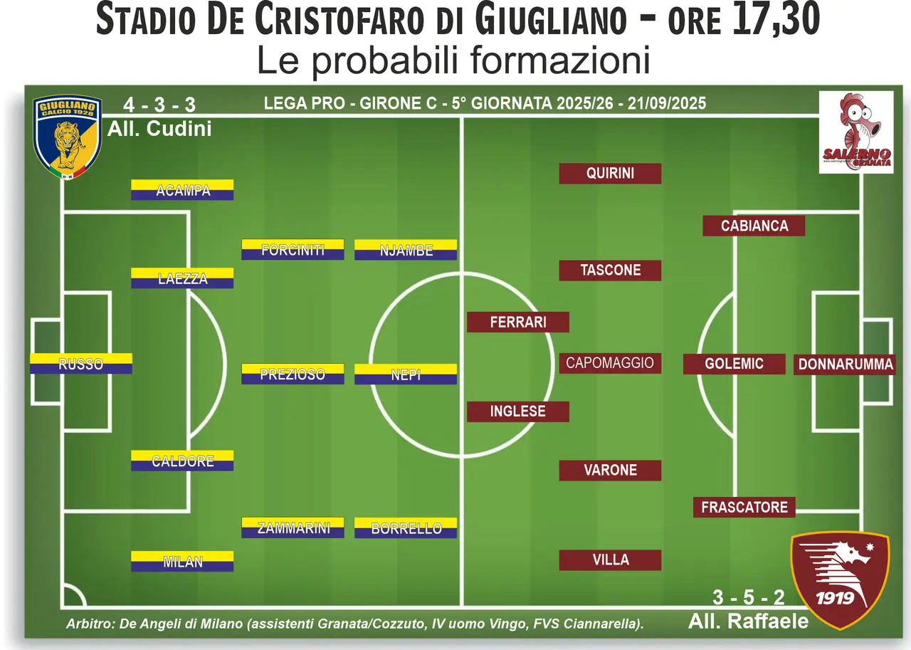 Salernitana (3-5-2): Donnarumma; Cabianca, Golemic, Frascatore; Quirini, Tascone, Capomaggio, Varone, Villa; Inglese, Ferrari.