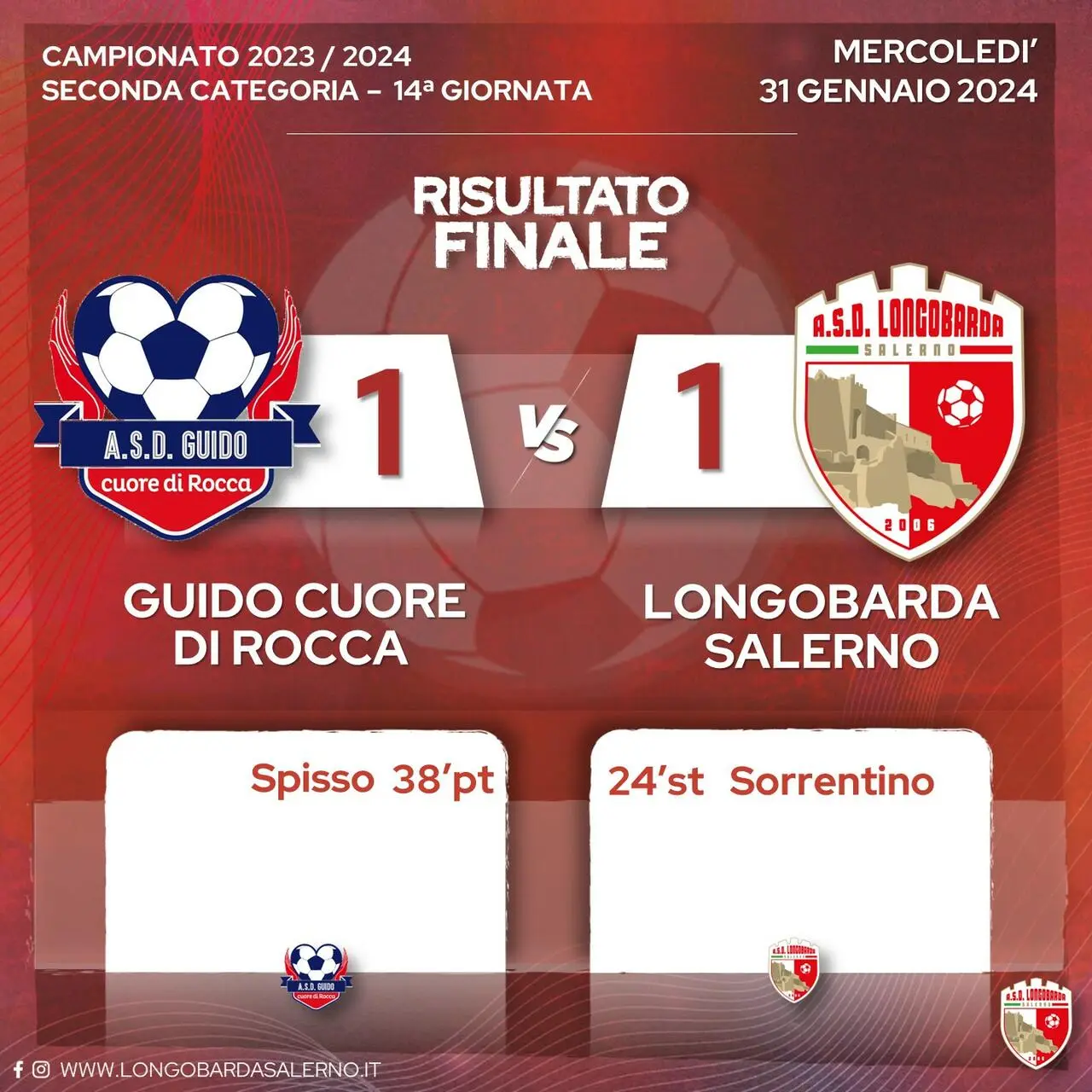 La Longobarda Salerno acciuffa un importante pareggio nella difficile trasferta di Roccapiemonte contro l'ASD Guido Cuore di Rocca nel recupero della gara sospesa al 12' del 20 gennaio scorso. Sostanzialmente un tempo per parte e 1-1 finale giusto; la prima frazione di gioco vede i padroni di casa spingere di più e Bassi è costretto ad un paio di interventi prima di capitolare su una ripartenza fulminea che termina con il sinistro ad incrociare vincente di Spisso. La migliore palla degli ospiti capita sul destro di Casella abile a concludere dopo un'incursione ma la sfera termina di poco alta. La seconda metà di gioco è caratterizzata dalla veemente reazione degli uomini di mister Avellino che non ci stanno a perdere e alzano il baricentro. Così è Bonanno che con una verticalizzazione immediata, dopo aver recuperato palla, pesca Sorrentino che beffa il portiere sul primo palo. L'inerzia del match ora è tutto a favore dei biancorossi che sfiorano l'impresa con Marco Romeo ed Aprea, ma si espongono a pericolose ripartenze dei rocchesi. Nemmeno il tempo di recuperare ed arriva subito la sfida altrettanto cruciale contro l'Intercampania che si disputerà con tutta probabilità sabato 3 febbraio.