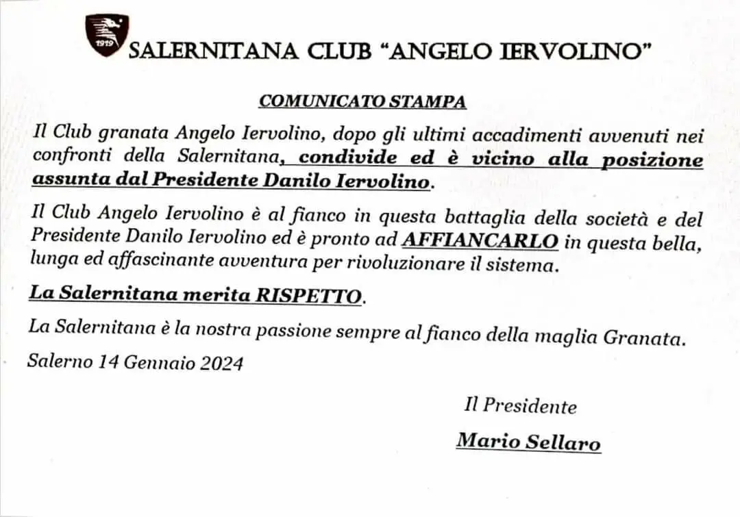 Anche il club Angelo Iervolino ha emesso un comunicato dove si esterna tutta la massima fiducia nell'operato del presidente granata e sono pronti ad affiancarlo in questa battaglia.