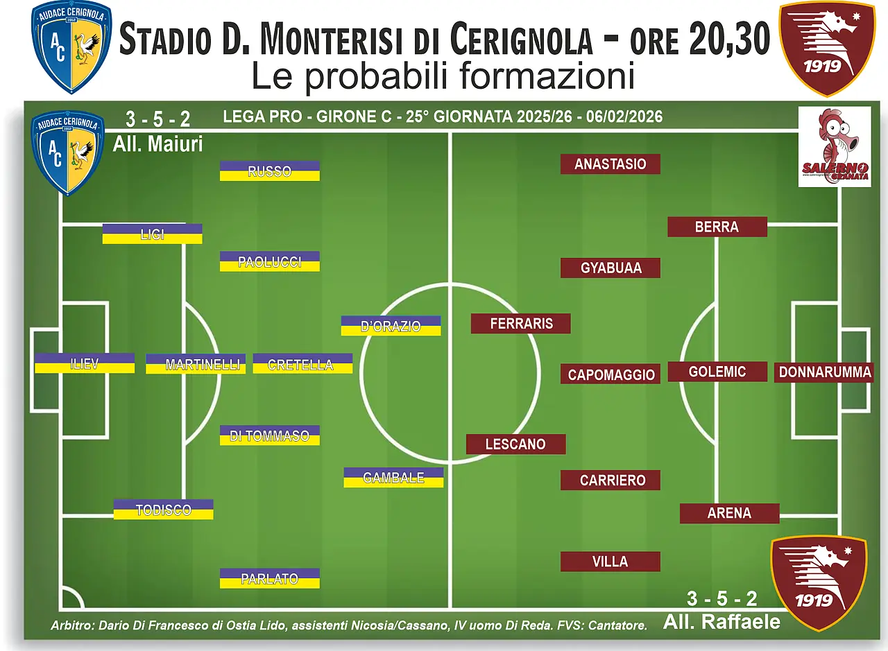 Nella 25' giornata di campionato la Salernitana e di scena nel serale contro L'Audace Cerignola che all'andata espugnò l'Arechi grazie anche asd una direzione arbitrale a dir poco scandalosa di Toma Mbei. Motivo in più per “vendicare” quella inopinata sconfitta, e soprattutto provare a non perdere ulteriore terreno nei confrontio delle due battistrada Benevento e Catania, dopo losop parziale interno contro il Giugliano.