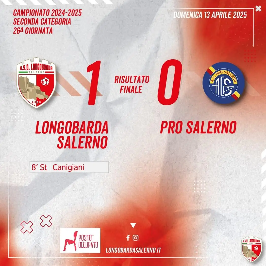 Nella ripresa, è la Longobarda a trovare il gol vittoria con un gran gol dalla distanza proprio di Canigiani, che batte Rulli al volo da posizione defilata. Nel finale, la Pro Salerno prova l’arrembaggio per trovare il pari senza impensierire Scermino prima e Minella poi, subentrato allo stesso Scermino.