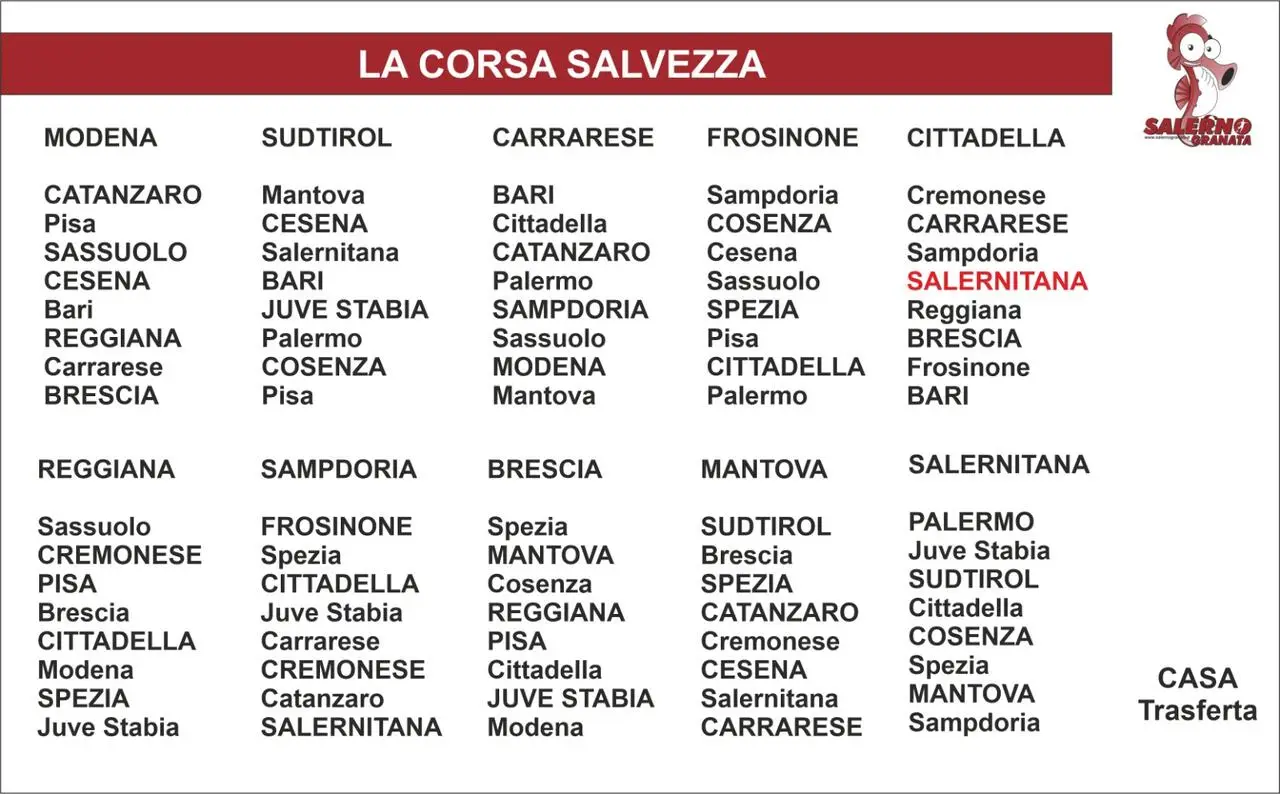 Non solo la Salernitana. Anche altre squadre impegnate nella corsa salvezza – come Cittadella, Brescia, Reggiana, Carrarese, Modena e Mantova – hanno un calendario pieno di incroci diretti. Proprio questo fitto intreccio di confronti tra “pericolanti” potrebbe abbassare sensibilmente la soglia per la salvezza. Se in tempi recenti si parlava di 45 punti, ora la quota potrebbe realisticamente assestarsi intorno ai 42, complice il numero elevato di scontri tra squadre in difficoltà che finiranno per togliersi punti a vicenda.