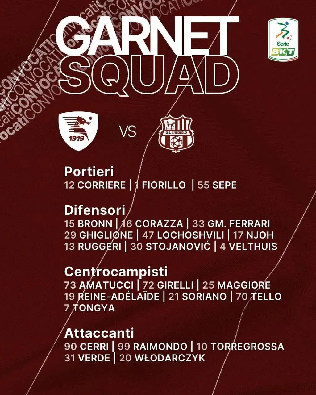 Al termine dell’allenamento mattutino il mister Roberto Breda ha diramato la lista dei convocati per la gara in programma domani tra Salernitana e Sassuolo.