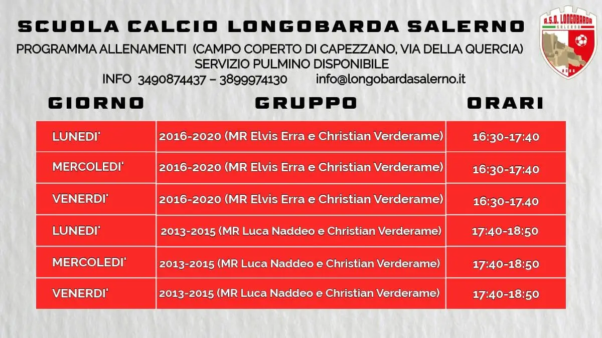 Gruppo A (2016–2020) → allenamenti dalle 16:30 alle 17:40 con i mister Elvis Erra e Christian Verderame.