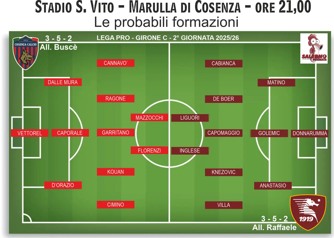 Il Cosenza di Buscé riparte dal 3-5-2, con un’idea chiara: solidità difensiva e spinta sugli esterni per mettere in difficoltà gli avversari. Davanti a Vettorel ci saranno D’Orazio, Caporale (seguito a lungo proprio dalla Salernitana) e Dalle Mura. In mezzo Kouan, Garritano e Ragone a dare equilibrio, mentre sulle corsie agiranno Cimino e Cannavò. In attacco fiducia alla coppia Florenzi-Mazzocchi, chiamata a capitalizzare le occasioni in un match che per i rossoblù rappresenta un test di maturità davanti al proprio pubblico, seppur ridotto.