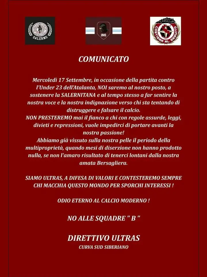 «Mercoledì 17 Settembre, in occasione della partita contro l’Under 23 dell’Atalanta, NOl saremo al nostro posto, a sostenere la SALERNITANA e al tempo stesso a far sentire la nostra voce e la nostra indignazione verso chi sta tentando di distruggere e falsare il calcio.