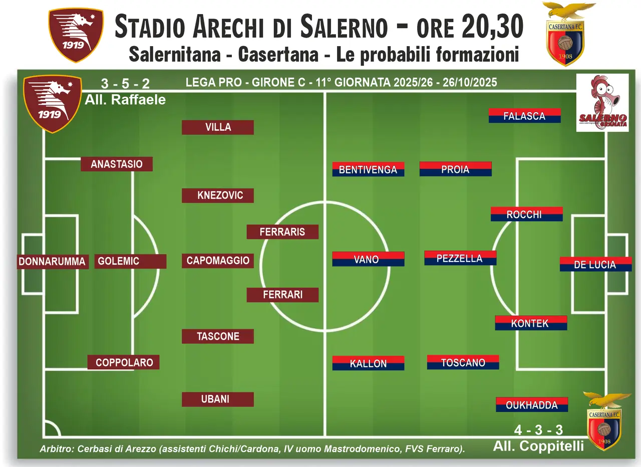 Coppitelli recupera Proia dopo due giornate di squalifica e dovrebbe ripartire dal 4-3-3. Davanti a De Lucia la linea dovrebbe essere Oukhadda-Kontek-Rocchi-Falasca, con Toscano, Pezzella e Proia in mezzo. Davanti, ampiezza e gamba: l’ex Kallon e Bentivegna larghi, con Vano riferimento centrale, pronto a fare a sportellate con i tre centrali granata. È un tridente che sa allungare le difese e che costringe a coperture preventive pulite: se la Salernitana non è corta tra i reparti, rischia.