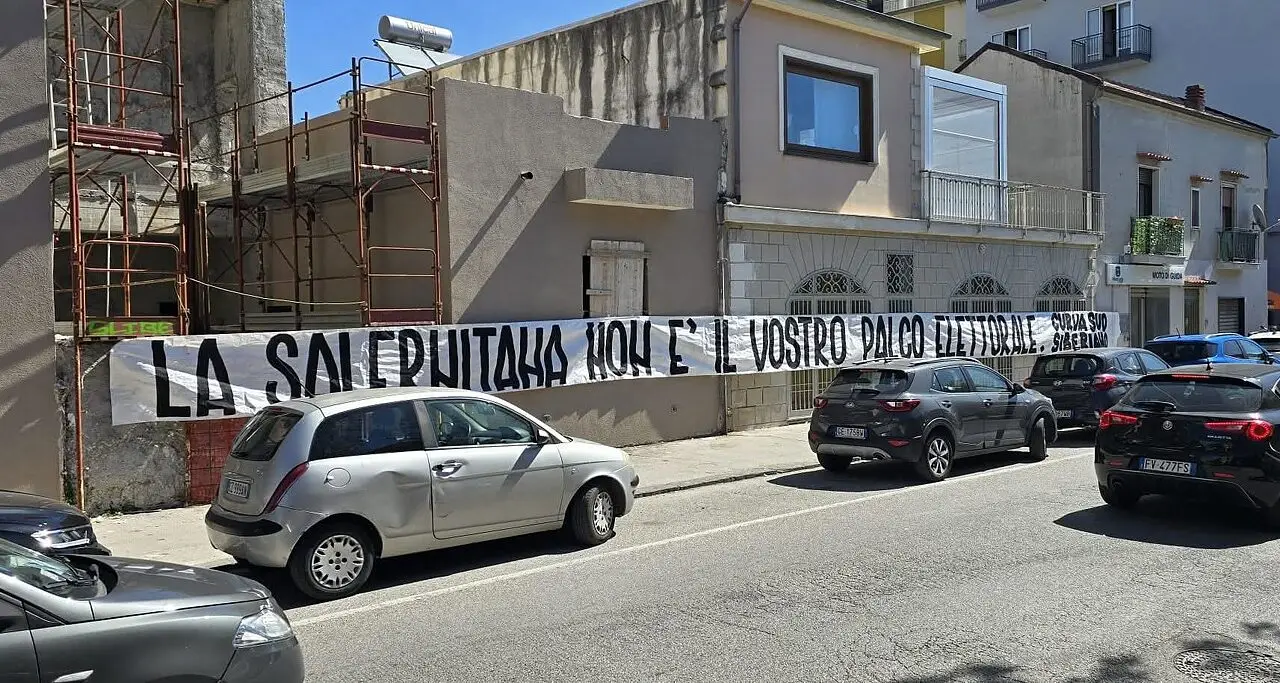 Nuovo striscione della Curva Sud Siberiano, dopo quello esposto all'Arechi contro il candidato sindaco Vincenzo De Luca, questa volta esposto nei pressi del Polo Nautico in occasione della conferenza stampa di Zambrano, anche lui candidato a sindaco: