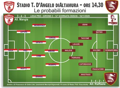 Team Altamura–Salernitana, probabili: Ubani dal 1’, Liguori-Ferraris dietro Inglese; Mangia conferma il 3-4-3