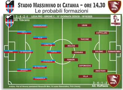 Catania–Salernitana al “Massimino”: big match da vertice, Ferraris dietro Ferrari-Inglese; Toscano con Forte riferimento e doppio trequarti