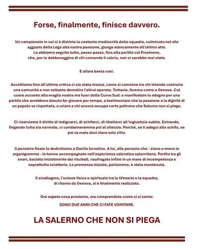 Comunicato Direttivo Salerno: "Saremo fuori anche domenica. Società, sono due anni che ci fate vomitare"