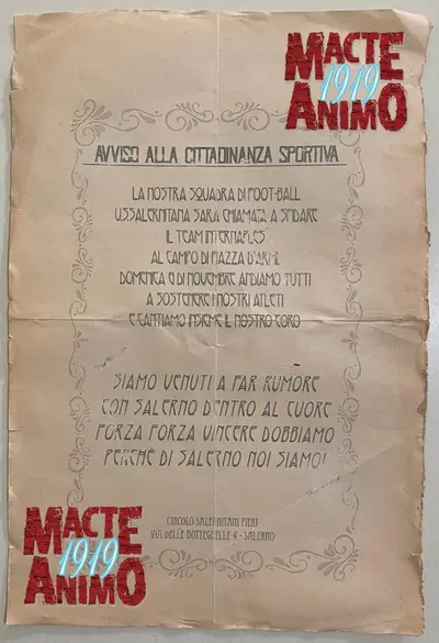 COMUNICATO STAMPA ASSOCIAZIONE “MACTE ANIMO 1919”; IL PRIMO CLUB DI TIFOSI IN ITALIA NASCE A SALERNO